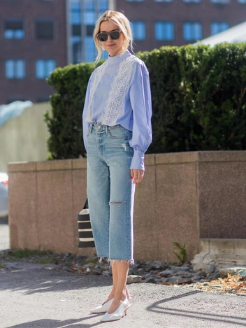 Укороченные джинсы с необработанным краем — универсальный и стильный вариант. Необработанные края придают классическому силуэту нотку остроты и индивидуальности. Сочетайте их с замшевыми куртками, с кожаными косухами, чтобы создать более запоминающийся образ, либо же наденьте туфли на каблуке и повяжите на плечи блейзер, чтобы создать более элегантный наряд в духе «новой роскоши» (читайте также: Базовый гардероб: одна рубашка — 5 образов на любой случай).