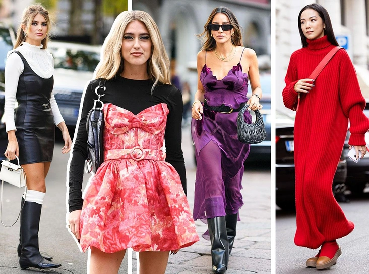 Как их интегрировать в образы? Для повседневных и романтических прогулок надевайте платья длины миди в пастельных тонах и сочетайте их с объемными свитерами, плащами и куртками, балансируя нежность и дерзость. Для вечерних выходов выбирайте темные комбинации на тонких бретелях с кружевными вставками или без них — они идеально подойдут и для новогодней ночи, и для ужина.