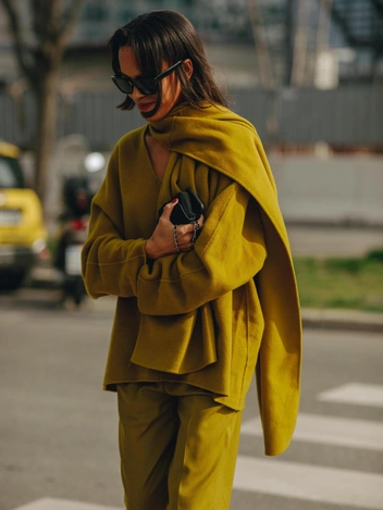 Кашемир считается эталоном мягкости и комфорта и в этом сезоне своих позиций не сдает. Он универсальный и теплый, что делает его абсолютным фаворитом среди материалов для зимнего гардероба. Если вы решитесь на покупку такого шарфа, присмотритесь к однотонным моделям в спокойной цветовой гамме. Такой аксессуар безупречно подходит для многослойных образов: из-за того что он тонкий, он не будет топорщиться под пальто или курткой.
