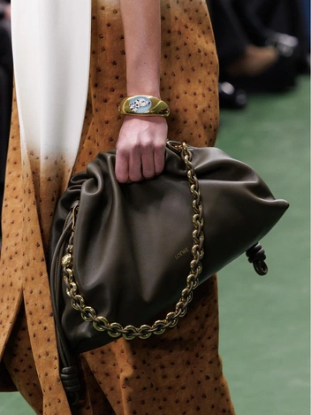 Этот аксессуар ввел в моду несколько сезонов назад итальянский бренд Bottega Veneta и сделал это так, что теперь о нем мечтают все девушки мира, а другие бренды стремятся повторить форму It-bag. Так, в новом осенне-зимнем сезоне тренд на «пельмени» продолжили Rokh и Loewe, представив сумки в самых разных размерах и цветах. Тем не менее, их все объединяет сборка сверху. Носить их следует как клатч — под рукой.
