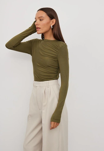 Топ с драпировкой подходит для нарядного и романтичного образа. Такой элемент гардероба может быть как с длинными рукавами, прикрывающими пальцы, так и вовсе без них. В тренде также вариант со спущенными плечами — он подчеркнет вашу шею и визуально ее удлинит (читайте также: Как тренировать насмотренность: советы по развитию вкуса).