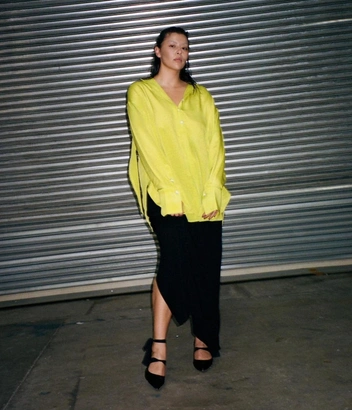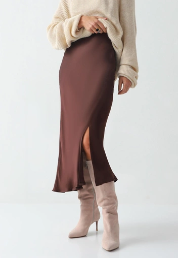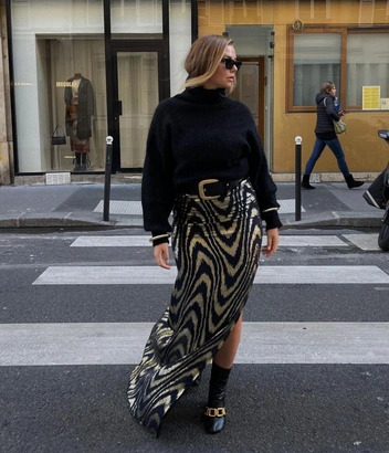 Многим кажется, что атласная струящая юбка это вариант на весну и лето, но спешим вас переубедить, ведь осенью она смотрится не менее органично. Девушки работают с ней на контрасте: легкий материал они балансируют строгими пиджаками и грубыми туфлями или ботинками на шнуровке.