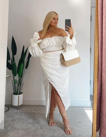 Стилизовать такую юбку можно с объемным пиджаком, который создаст необходимый баланс в образе. В качестве обуви отдавайте предпочтение остроносым ботильонам или же актуальным сапогам-трубам, которые выбирают сейчас самые модные девушки (читайте также: Без комплексов: 8 самых стильных звезд plus size).
