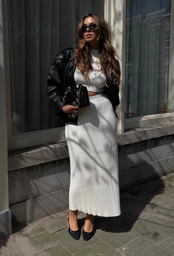 Поскольку такая вещь является широкой и объемной, верх должен быть более узким. Носите юбку в виде трапеции с облегающими лонгсливами, топами, водолазками — такой стилизацией вы сделаете акцент на талии и правильно расставите пропорции в образе.
