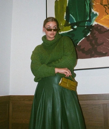 Плиссированные юбки продолжают пользоваться спросом среди модниц, ведь они выглядят необычно и ярко. Отдавайте предпочтение актуальной длине миди, которая позволит приоткрыть щиколотки ног. Что касается цвета, то в этом сезоне присмотреться стоит к осенним цветам: бордовому, коричневому, горчичному и темно-зеленому — их вы сможете легко вписать в многослойные образы.