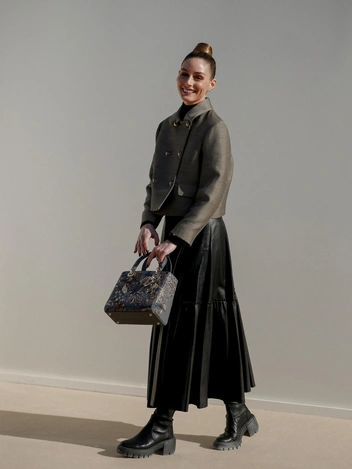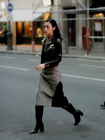 Стилизовать их в образах следует на контрасте: грубый материал сочетайте с нежным и струящимся. Например, дополните кожаную юбку до колена шелковой блузой в черном или молочном оттенке, завершив образ золотыми украшениями.
