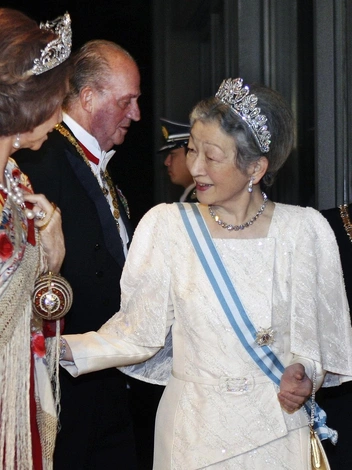 Еще одна популярная тиара среди императриц — бриллиантовая тиара с завитками. Жена императора Акихито Митико часто носила ее в первые годы пребывания в императорской семье. Впервые она примерила ее в день свадьбы — 10 июля 1959 года, дополнив роскошное украшение тяжелым колье с завитками. Когда ее сын сообщил о желании жениться, Митико подарила изысканный бриллиантовый комплект своей невестке Масако. Нынешняя императрица Японии впервые надела его также на собственную свадьбу с наследным принцем (читайте также: Призрачная тиара Гессенов: пугающая история одного из самых красивых королевских украшений).