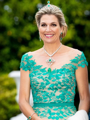 Одна из самых универсальных диадем из коллекции Оранских принадлежит к голландскому изумрудному парюру. Ее Максима носит как с колье и серьгами из того же комплекта, так с другими изумрудными украшениями из королевской сокровищницы.