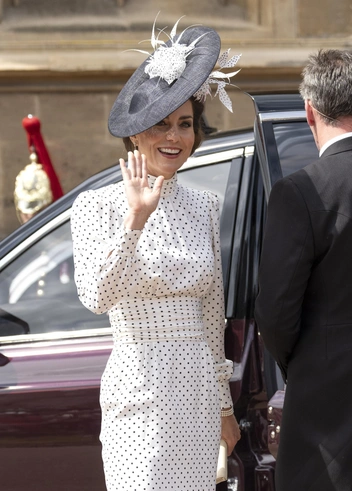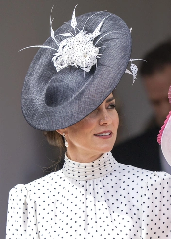 Принцесса Кейт остановилась на платье в горошек с длинными рукавами и затянутой талией от Alessandra Rich. Детали из перьев на черной шляпе Уэльской также были покрыты крошечным горошком, что создавало целостный модный образ, как всегда тщательно продуманный стилистами.