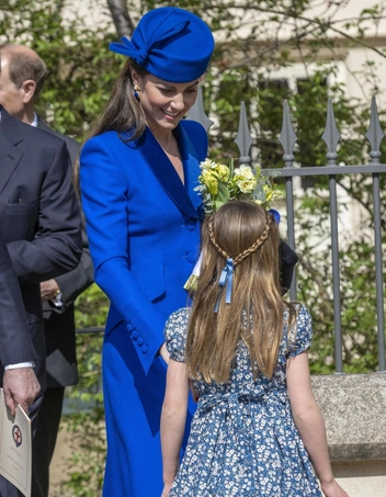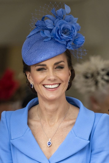 На церемонии Уэльская предстала в стильном образе небесного оттенка. Шляпка от Juliette Botterill с цветочным листом выигрышно подошла к нежному наряду принцессы. Тканое соломенное основание шляпы было украшено сеткой и массивом шелковых роз.
