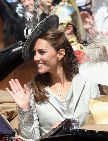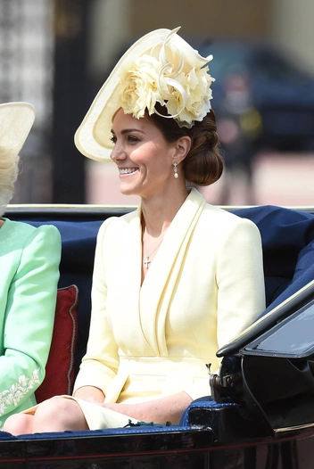 На своем дебютном параде в честь дня рождения правящего монарха Уэльская заслужила внимание публики, представ в белом платье Alexander McQueen. В нежный ансамбль Кейт внесла черную шляпу от Сильвии Флетчер, создавшую аккуратный градиент с волосами принцессы каштанового цвета и белым платьем.