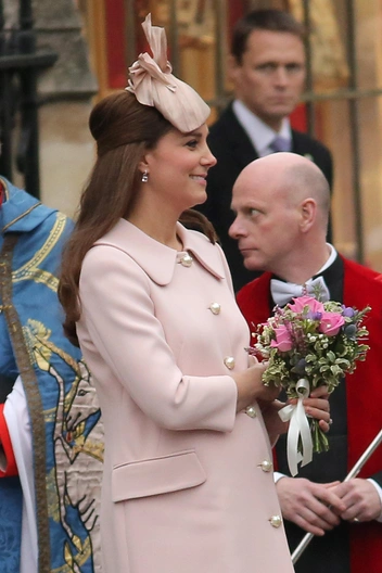 На такое знаменательное событие Кейт предпочла темно-розовое платье, разработанное модельером Сарой Бертон (читайте также: «Интересные факты о свадьбе принцессы Евгении и Джека Бруксбэнка»). Дополнением кокетливому ягодному образу послужили бархатные лодочки, клатч и, конечно, маленькая шляпа с вуалью от Philip Treacy, украшенная цветами.