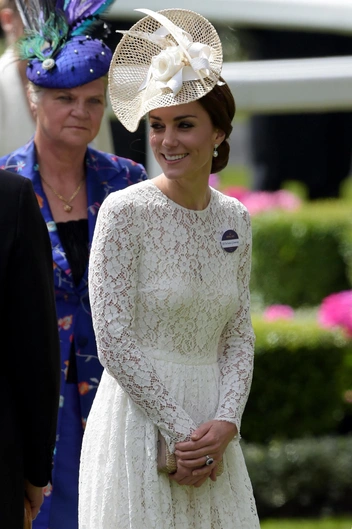 «Ранняя Кейт» часто отличалась выбором в пользу одежды светлых оттенков. Поэтому на своих первых скачках тогдашняя герцогиня появилась в белом кружевном платье Dolce & Gabbana и объемной сетчатой шляпе с кремовой розой от Jane Taylor.