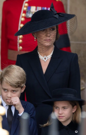 Несмотря на печальное настроение события, нельзя не отметить, как потрясающе на нем выглядела Кейт (читайте также: «Невозможно сдержать слез: 25 самых трогательных фотографий Виндзоров на похоронах Елизаветы»). Траурный черный цвет не помешал принцессе приковать внимание публики за счет шляпы с широкими полями и тонкой вуалью от Philip Treacy, которой она дополнила платье-пальто Alexander McQueen. В качестве аксессуара Кэтрин выбрала жемчужное ожерелье, когда-то принадлежавшее покойной королеве.