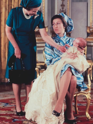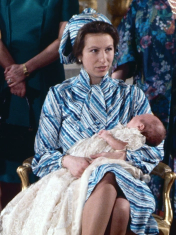 Единственная дочь королевы выглядела как истинная икона стиля на крещении своего сына Питера в 1977 году. На принцессе Анне был комплект из платья и головного убора в эффектную полоску в синей гамме и лаковые туфли. Королева была одета под стать своей дочери, что совсем не редкость для Елизаветы и Анны.