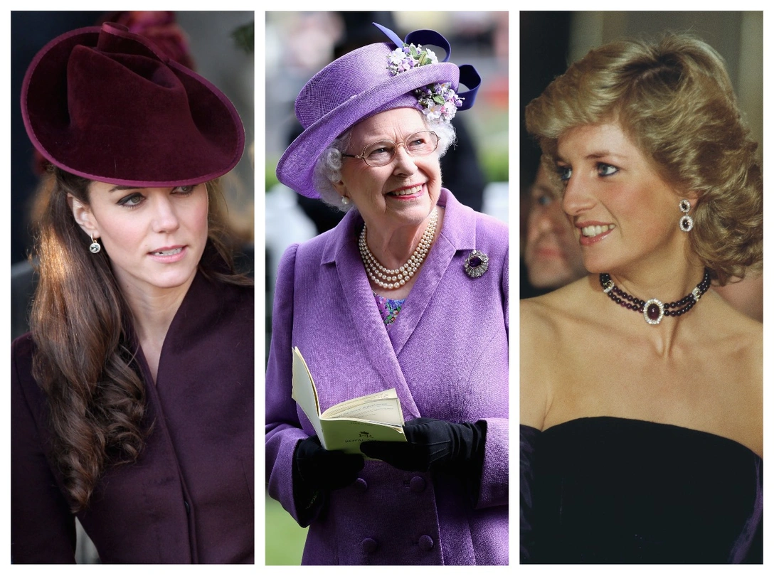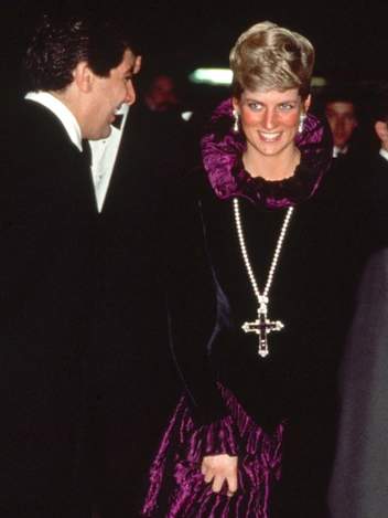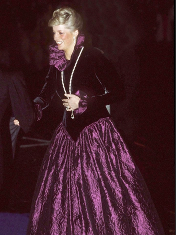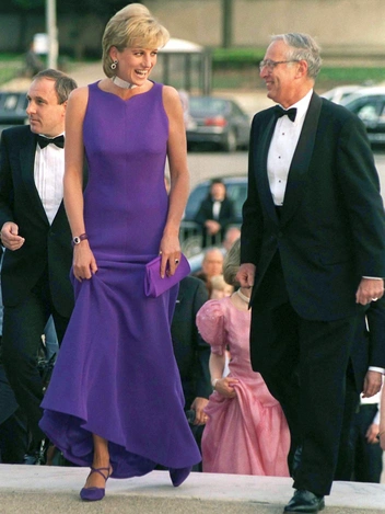 Принцесса Диана восхитила публику, появившись в монохромном фиолетовом ансамбле на гала-вечере в Чикаго летом 1996 года. Длинное пурпурное платье Versace, туфли Jimmy Choo и клатч в тон Уэльская дополнила серьгами-каплями с бриллиантами и аметистами, браслетом с тремя нитями из полированных аметистовых бусин, скрепленными вместе овальной аметистовой застежкой, окруженной бриллиантами (это тот самый браслет из комплекта с чокером, продемонстрированным Дианой в 1987-м), и колье из жемчуга с рубиновыми вкраплениями.