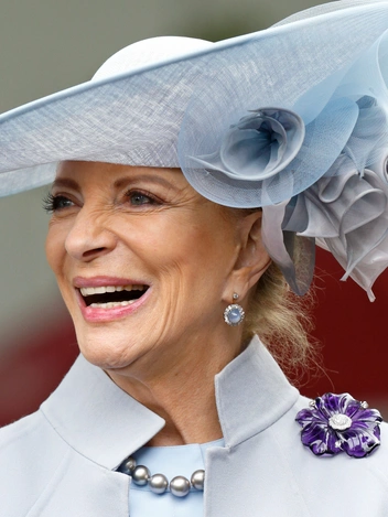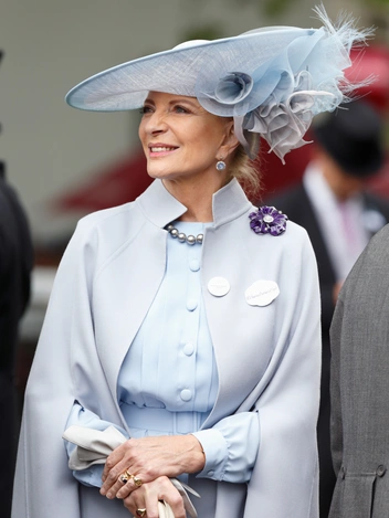 Для третьего женского дня скачек в Аскоте в 2016 году принцесса Майкл Кентская выбрала нежный голубой ансамбль из платья, накидки и обязательной для посетительниц королевских скачек шляпы. Композицию довершила брошь в виде анютиных глазок с аметистом.