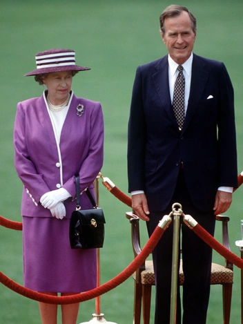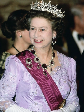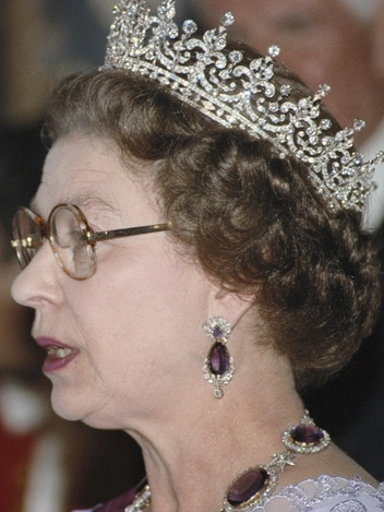 Полный комплект Ее Величество носит нечасто, но вот брошь от Кентского парюра Елизавете определенно по нраву. Эффектное украшение с тремя съемными аметистовыми подвесками монарх надела на встречу с американским президентом Джорджем Бушем-старшим во время турне по США в 1991 году.
