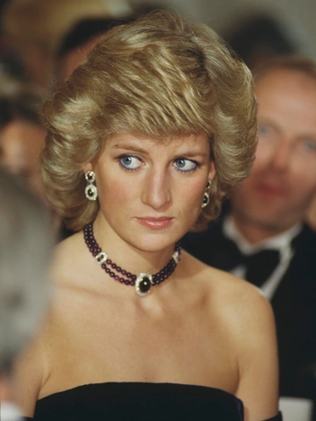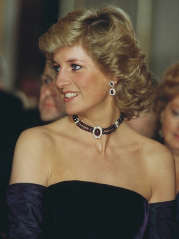 В 1987 году в ходе визита в Германию принцесса Диана посетила Мюнхенскую оперу. На супруге принца Чарльза было платье Catherine Walker из фиолетового бархата. Его дополнило колье-чокер из двух нитей полированных аметистовых бусин, соединенных несколькими брошами с крупными камнями, и серьги, повторяющие сочетание аметистов с бриллиантами. К чокеру прилагается похожий браслет, но его принцесса продемонстрировала в другой раз, так как в оперу она прибыла в высоких фиолетовых перчатках.