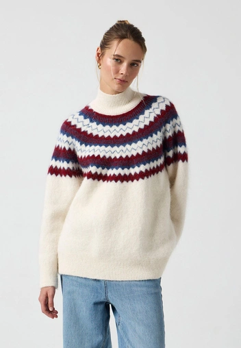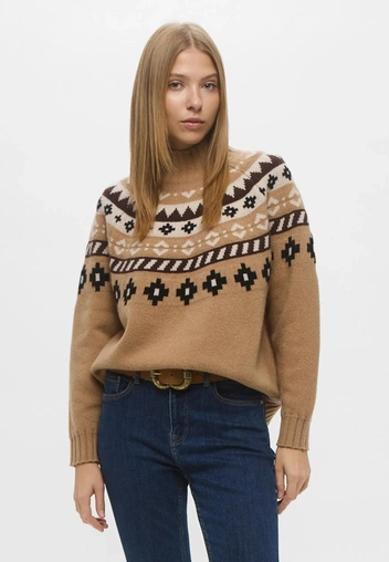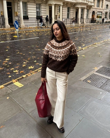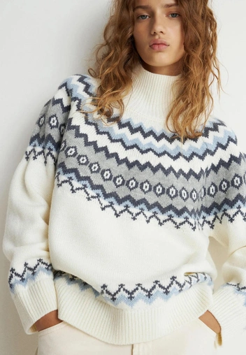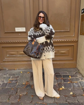 Наденьте свитер с крупным нордическим узором со светлыми или молочными брюками, чтобы срифмовать каждую деталь орнамента. Идеальный фешн мэтч случится, если оттенок принта будет на полтона темнее, чем вторая, базовая часть цветовой комбинации. Такой прием визуально «подсвечивает» рисунок и делает свитер главным героем образа, а не просто теплым слоем.