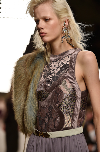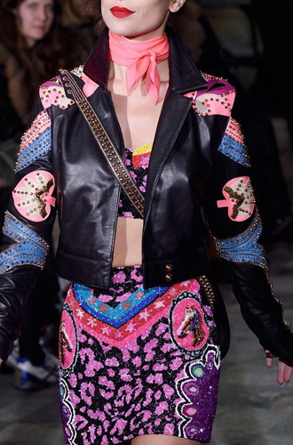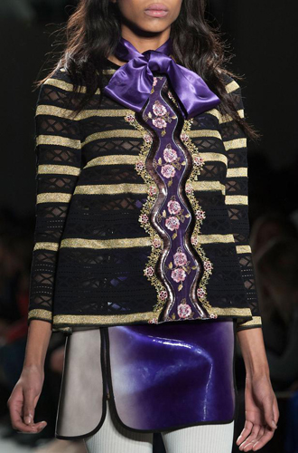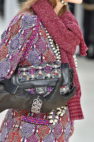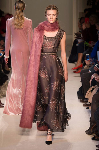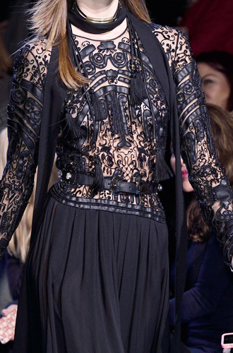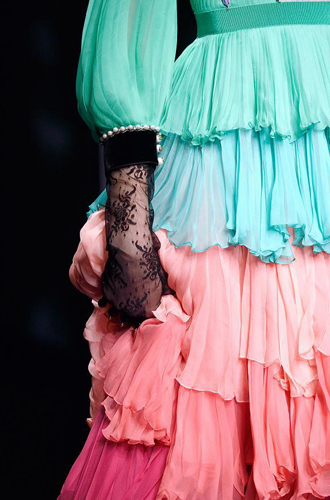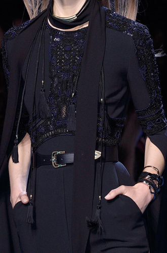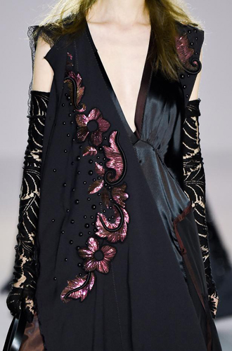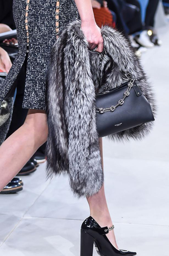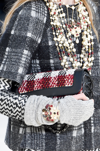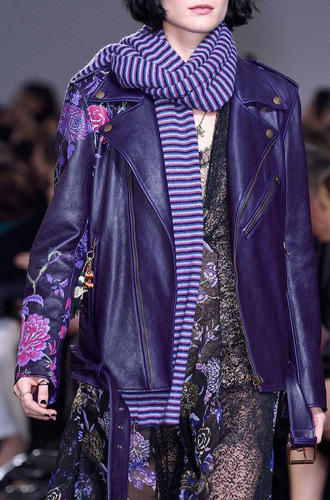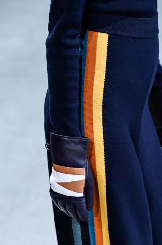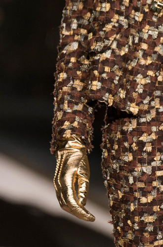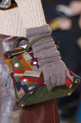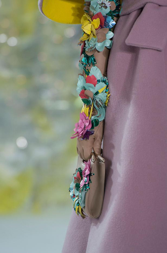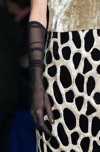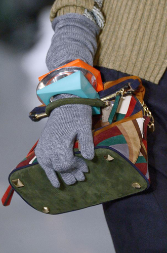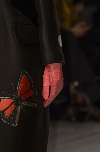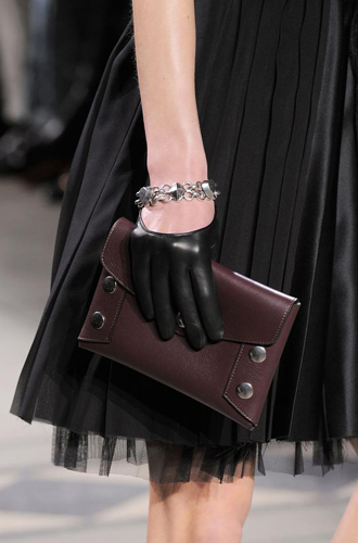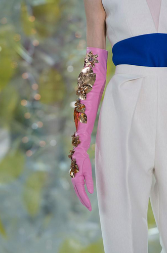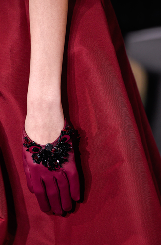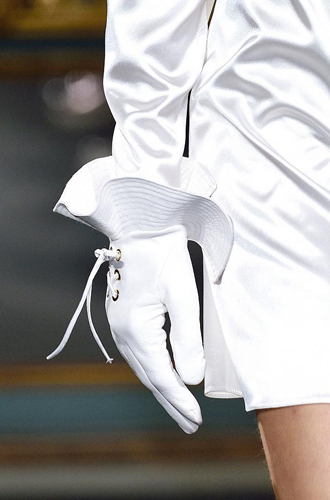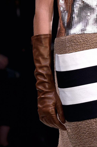 Chanel демонстрирует классические черные перчатки с серебристой крагой. Alexander McQueen изготовил аксессуар из кожи рептилий цвета фуксии, а Louis Vuitton предлагает длинные перчатки в расцветке колорблокинг. Oscar de La Renta и Mulberry делает ставку на ультраженственные укороченные модели в черном и бордовом цветах, декорированные цепочками и каменьями, а Max Mara, напротив, апеллирует к женской силе и предлагает дамам носить длинные коричневые и голубые перчатки.