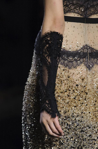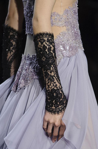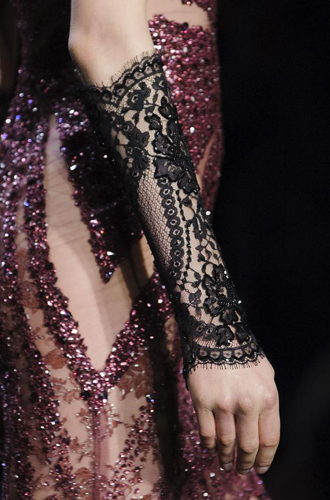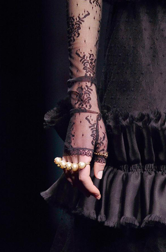 Marc Jacobs демонстрирует эту модель в коротком и длинном вариантах, некоторые из них декорированы женственным горошком. Gucci же признался в любви кружеву, из которого бренд изготовил миниатюрные перчатки-митенки. Но самый невероятный эффект производят, конечно же, черные прозрачные перчатки, декорированные ювелирными элементами. Так, Dries Van Noten украсил длинные перчатки жемчужной нитью, а Naeem Khan – серебристой вышивкой.