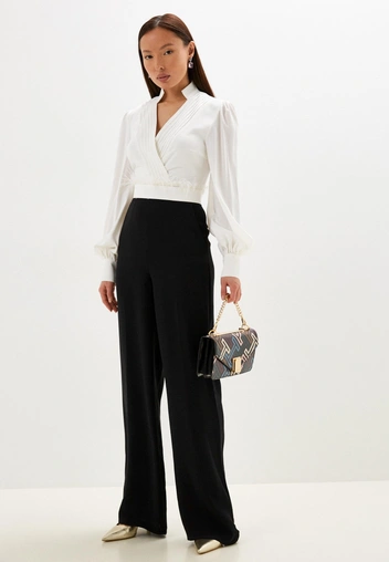 Для сотрудниц компаний со строгими правилами достаточно блузки с ненавязчивым бантом на талии, лаконичными оборками или тонкими разрезами на плечах. В пару к комплекту — туфли на каблуках (с широкими длинными брюками они зрительно сделают ваши ноги очень длинными) или остроносые балетки.