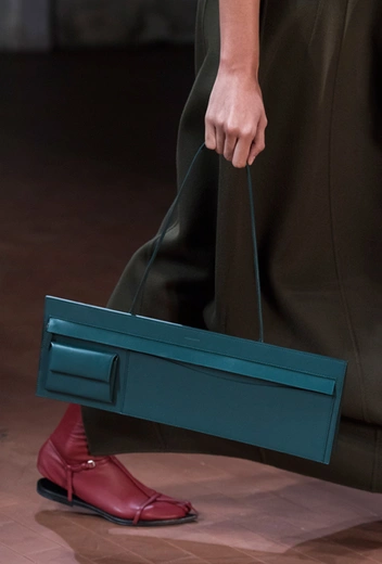 Самый востребованный вариант сумок нового сезона – продолговатые модели, своей длиной иногда доходящие до абсурда (в мудборд осени и зимы смело отправляем аксессуары с показа Rick Owens). Будет это клатч, удлиненный минодьер или простой кожаный шопер, свернутый вдвое – неважно. Особо присмотритесь к моделям Jil Sander в темно-синих, изумрудных и винных оттенках, а также к сумкам Anterprima с монограммами и небольшими ручками.