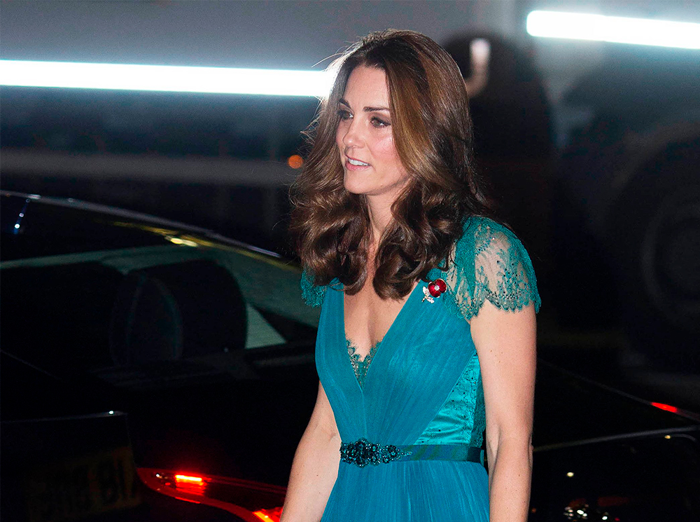 И, наконец, это платье Jenny Packham, которому уже больше семи лет, герцогиня снова надела 8 ноября 2018 года. Описывать его, думаем, нет нужды. Фотографии говорят сами за себя. Примечательно, что в этом образе не было ни единой новой вещи. Наряд мы уже видели в 2012 году на пре-пати для олимпийцев. Тогда же Кэтрин добавила к нему тот же бирюзовый клатч Jenny Packham. Серьги впервые были замечены на герцогине в 2011 году на мероприятии BAFTA. Драгоценности являются собственностью Ее Величества Елизаветы II. А внимательные поклонники Кембриджской отметили, что и серебристые босоножки Jimmy Choo Кэтрин выгуливала с этим же платьем несколько лет назад.