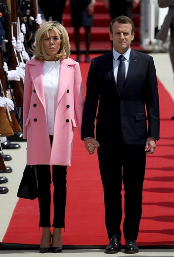 Гардеробу Первой леди Франции не свойственны сложные стилизации, яркий color-blocking, да и вовсе необычные сочетания контрастных цветов у нее случаются довольно редко. Несмотря на это, цветам (причем самым ярким и неожиданным) в гардеробе Брижит отведено особое место. Например, ярко-розовый тотал-лук смотрелся бы довольно приторно, поэтому Брижит стилизует пальто нежно-розового зефирного оттенка с уже привычной ей гардеробной формулой «скинни-брюки и белая рубашка». Выглядит такой ансамбль интересно и просто – совет от Первой леди точно стоит взять на заметку тем, кто к цветам относится с осторожностью, но не прочь поэкспериментрировать.