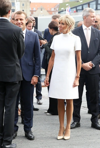 В минималистичном платье, вдохновленном стилем 60-х, Брижит предстала во время визита в Копенгаген в августе. В новом образе Первая леди вновь делает ставку на свои излюбленные фишки: простой цвет, удачная длина, открывающая стройные ноги, и небольшие, едва различимые акценты – в этом образе такими деталями стали несколько декоративных золотых пуговиц.