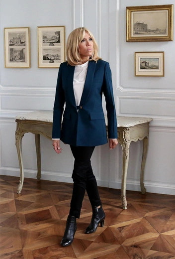 Одна из самых знакомых формул гардероба Брижит Макрон – белая рубашка, приталенный блейзер с увеличенной линией плеч, черные джинсы и ботильоны на устойчивом каблуке. На заметку стоит взять всем: в таком ансамбле Брижит появилась в Елисейском дворце, однако уместным комплект станет в разных ситуациях (и не обязательно быть супругой президента).
