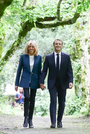 Насыщенный синий цвет для Брижит (как и для многих других влиятельных женщин мира), составляет базу. Он не такой мрачный, как черный, но более уместный, чем яркие контрастные цвета – более универсальный оттенок найти сложно. В такой палитре у Первой леди масса вещей, и самые ходовые – это ее любимые костюмы-двойки. В таком образе – мини-юбке с золотыми пуговицами и топе с длинными рукавами (конечно, от Louis Vuitton) – Брижит встречала Дональда и Меланию Трамп в Елисейском дворце.