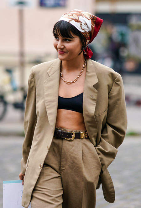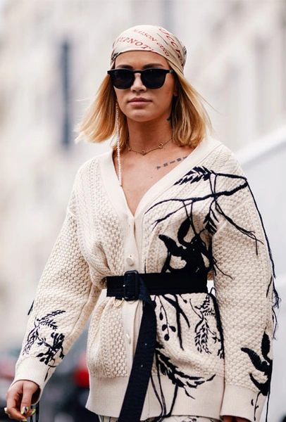 Самым классическим вариантом станут банданы с принтом пейсли или платки, усыпанные монограммами. Если такие акессуары вам не по душе, присмотритесь к шелковым платкам с абстрактными принтами или однотонным вариантам в привычных для вашего гардероба оттенках. Такие платки будут выглядеть более сдержанно и подойдут даже для женственного стиля. Завершите наряд легким чайным платьем с летним красочным принтом, минималистичными босоножками – и элегантный образ без намека на хип-хоп культуру готов.