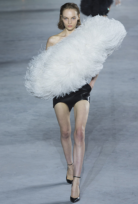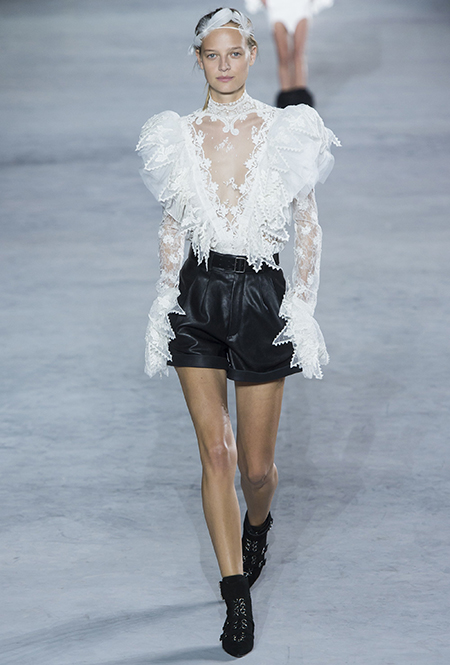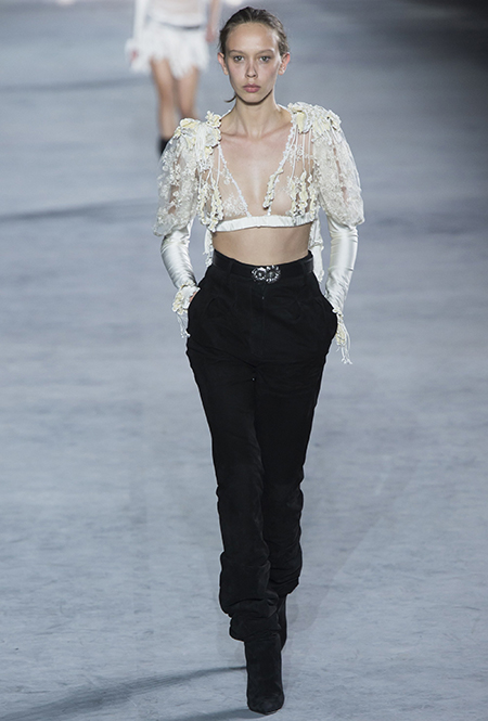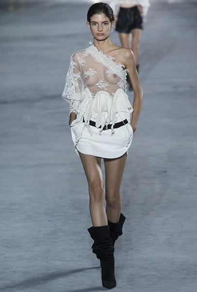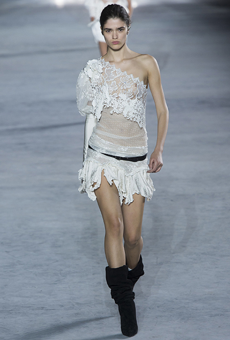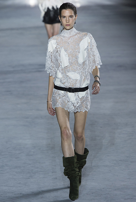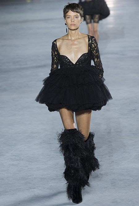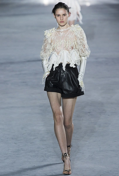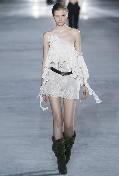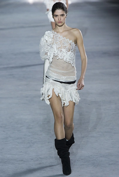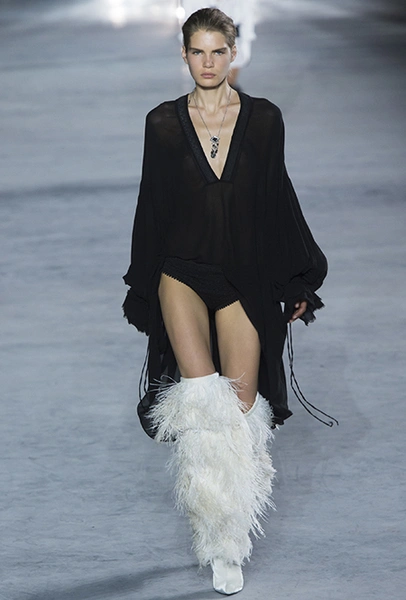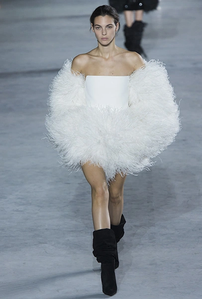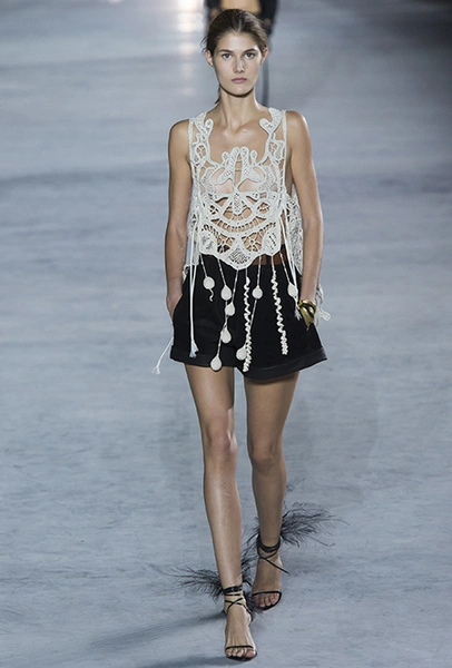 Вакарелло любит игру слоев и объемов. Белые блузы, платья и топы у него отделаны плотными рюшами и расшиты кружевом, которое напоминает не то морскую пену, не то потеки воска на догоревшей свече. Он создает архитектурные творения с объемными присборенными лифами и огромными вставками из бахромы. Бахромой украшены и сапоги с широким, как и в зимней коллекции, голенищем.