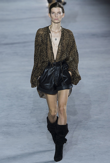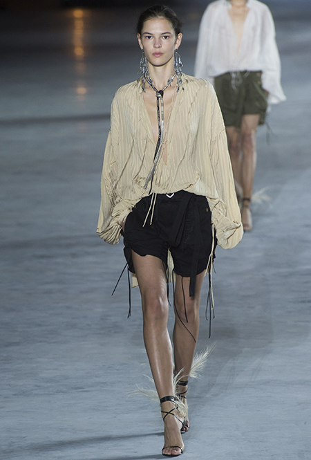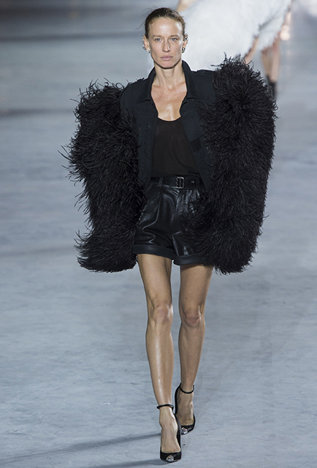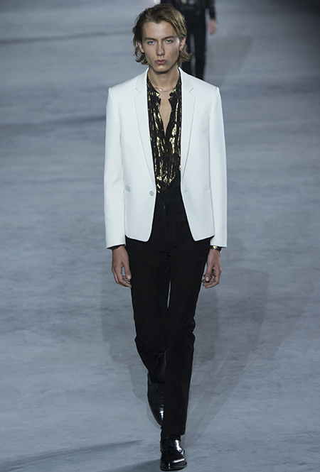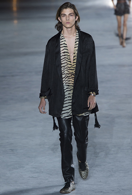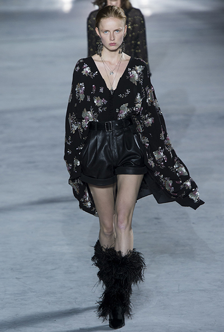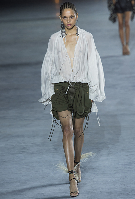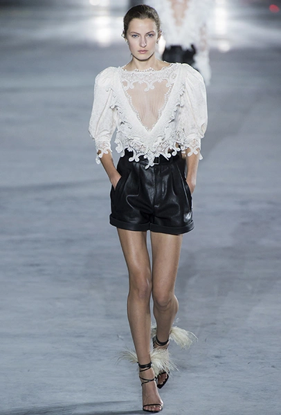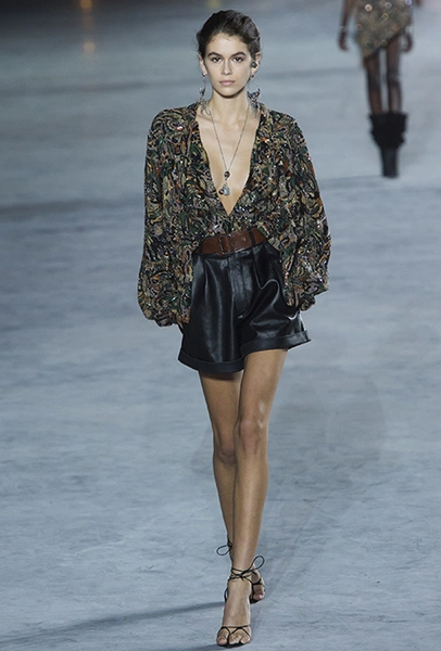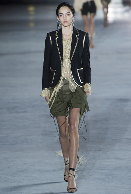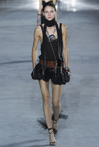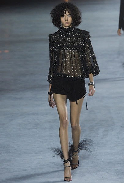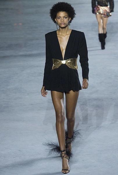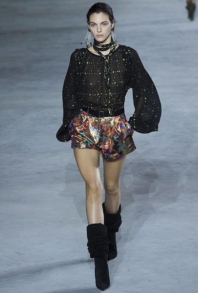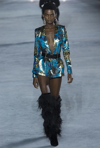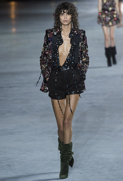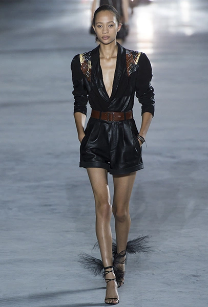 Но сказать, что Вакарелло не любит яркость тоже нельзя. В летней коллекции цвета предсказуемо больше, чем было в осенне-зимней, которая практически целиком была «чернее ночи». На этот раз Энтони выпустил на подиум яркие, из блестящей ткани, короткие комбинезоны с глубокими, до самого живота, V-образными вырезами. Золотистые и разноцветные принты вызывают ассоциации с внутренней облицовкой дворцов Марракеша, в которых обожал бывать Сен Лоран. То же можно сказать и о яркой вышивке, которой украшены короткие с закругленным подолом платья, трико со спущенными плечами и одна блуза с длинными летящими рукавами.