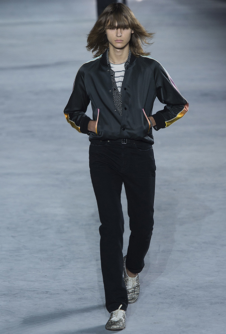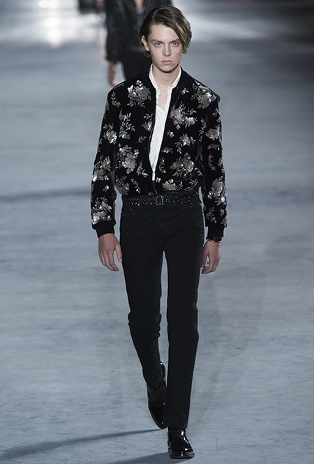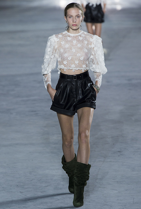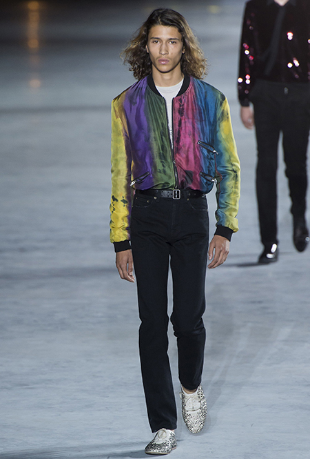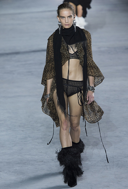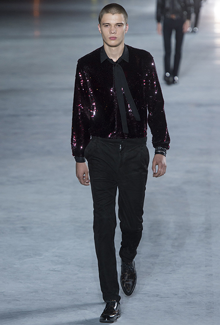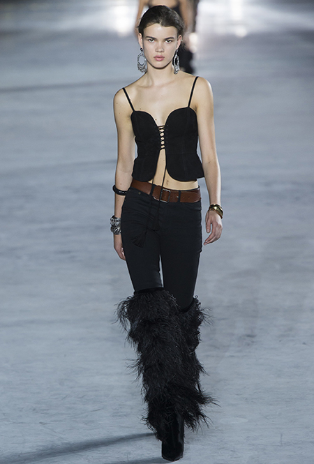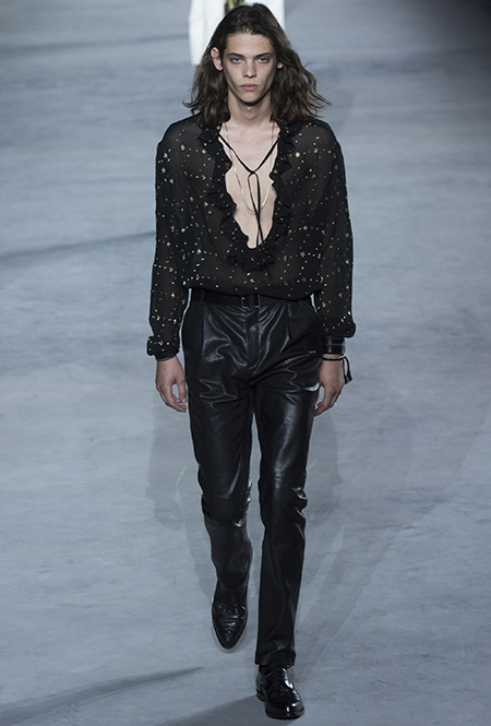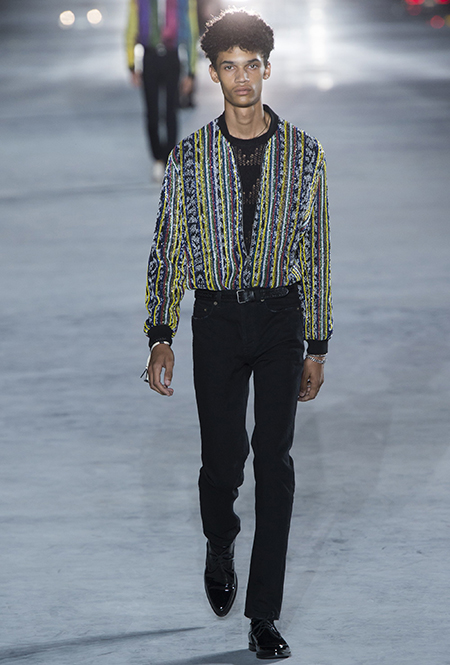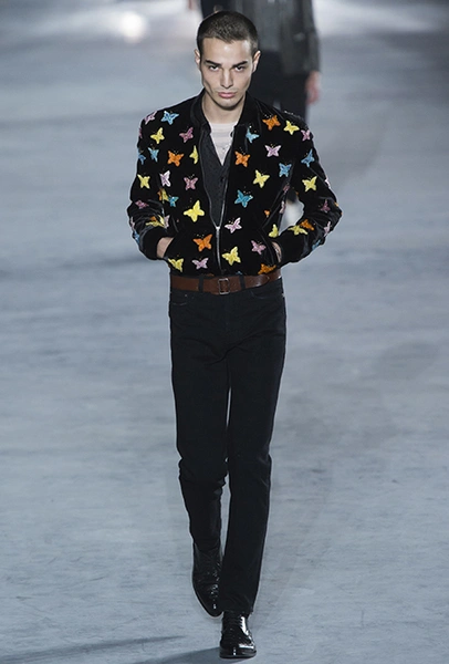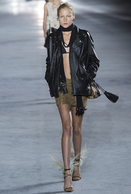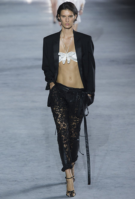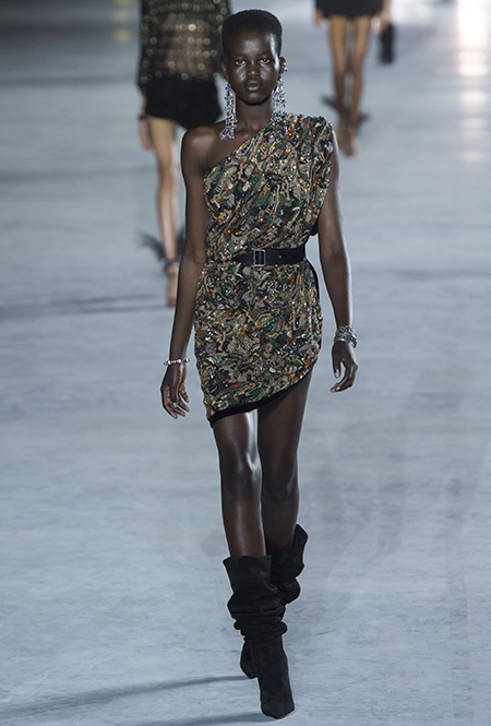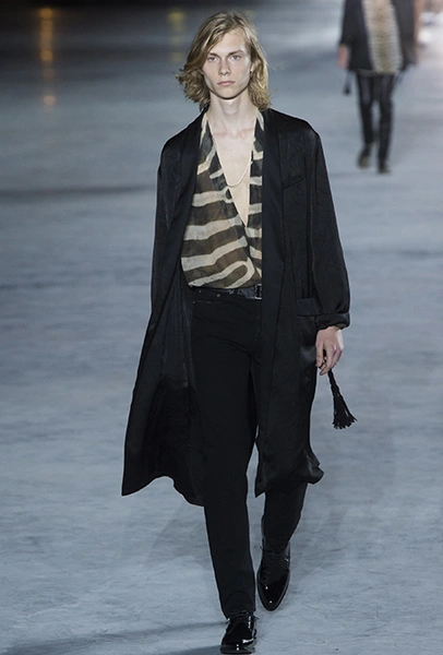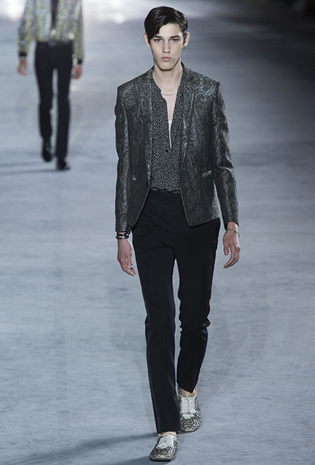 Но сказать, что Вакарелло не любит яркость тоже нельзя. В летней коллекции цвета предсказуемо больше, чем было в осенне-зимней, которая практически целиком была «чернее ночи». На этот раз Энтони выпустил на подиум яркие, из блестящей ткани, короткие комбинезоны с глубокими, до самого живота, V-образными вырезами. Золотистые и разноцветные принты вызывают ассоциации с внутренней облицовкой дворцов Марракеша, в которых обожал бывать Сен Лоран. То же можно сказать и о яркой вышивке, которой украшены короткие с закругленным подолом платья, трико со спущенными плечами и одна блуза с длинными летящими рукавами.