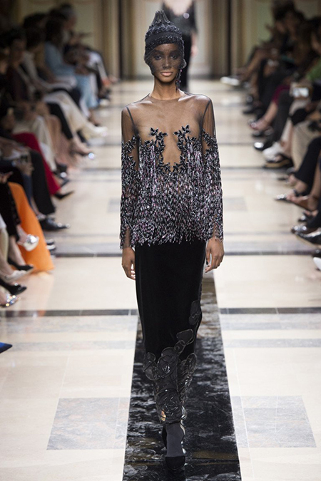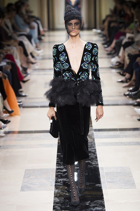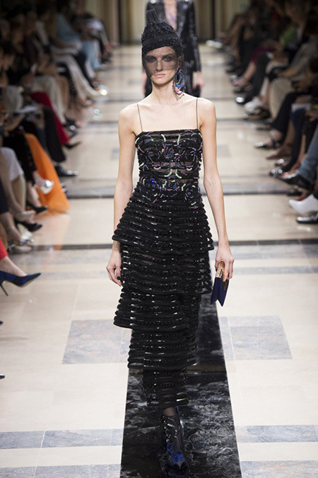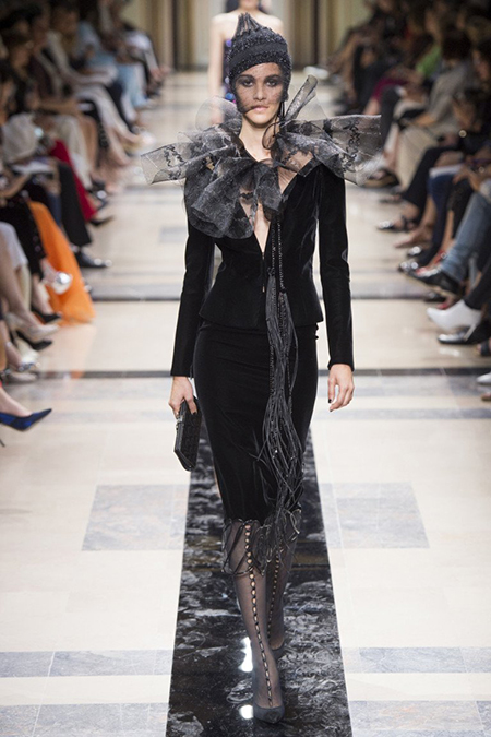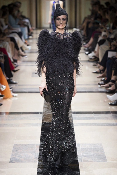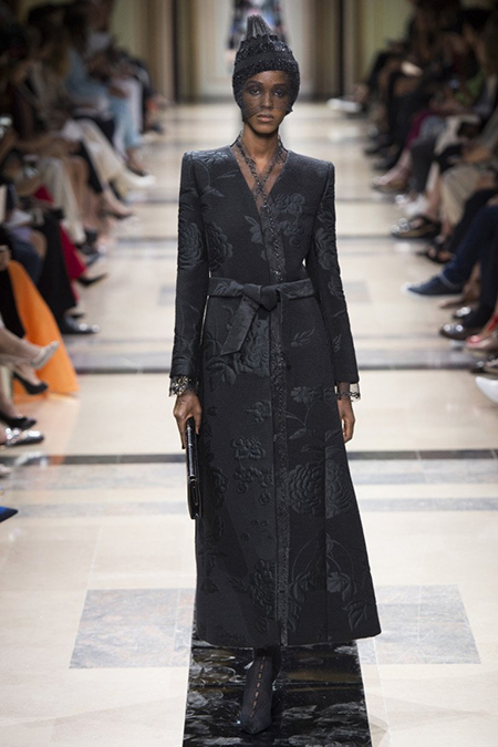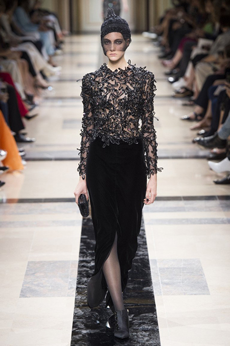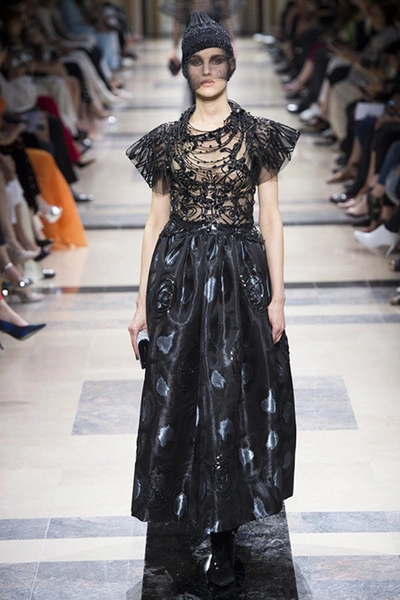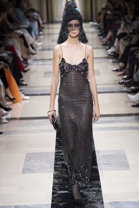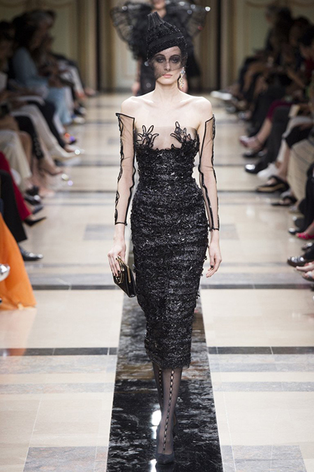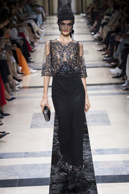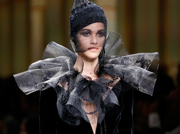 «Я хотел, чтобы коллекция была проникнута духом тайны», – рассказал журналистам сам дизайнер. Задуманное ему вполне удалось. Каждый из шестидесяти трех образов он дополнил особенным головным убором – длинной вытянутой черной шапочкой с блестками и черной вуалью, которая закрывает пол-лица. Вызывать соответствующие ассоциации призваны и яркие, похожие на маску, smoky eyes, – их моделям сделала визажист Линда Кантелло.