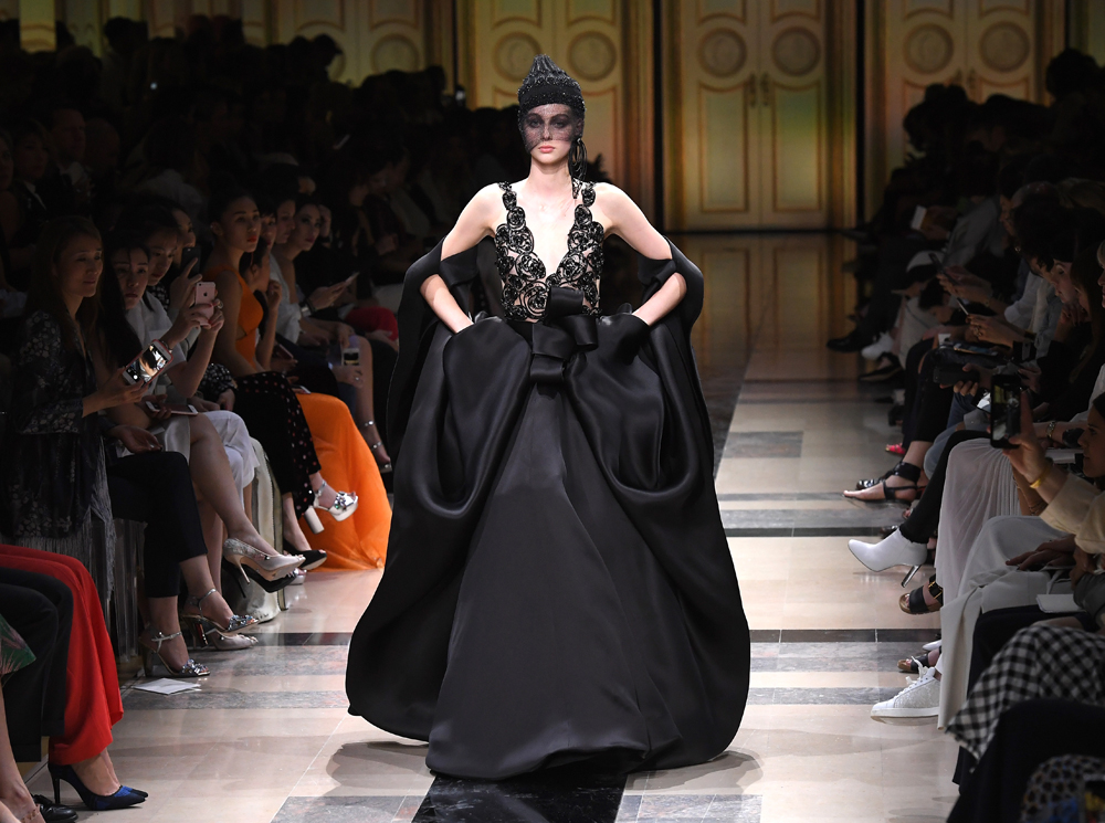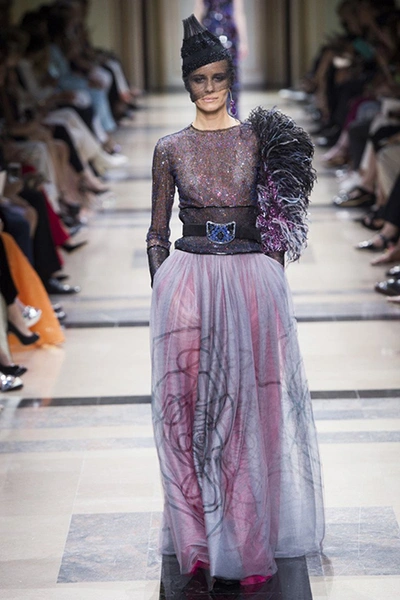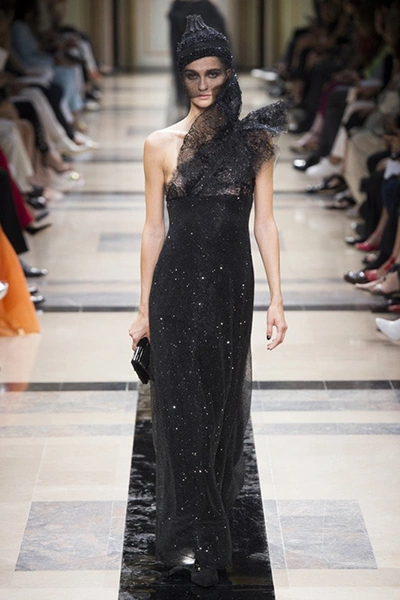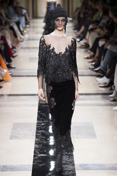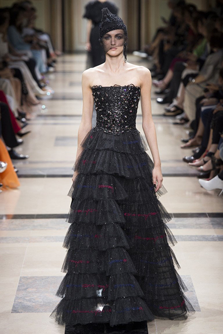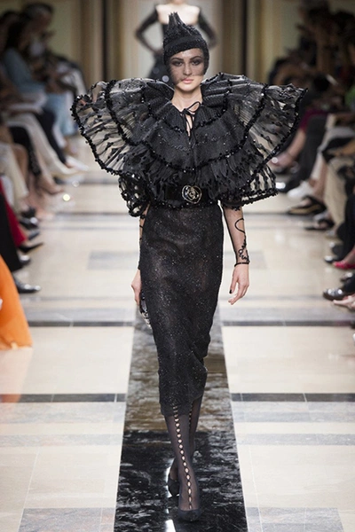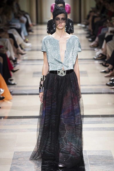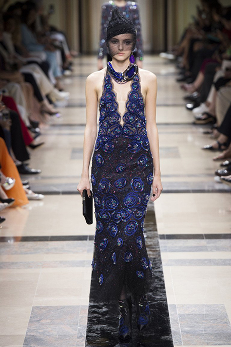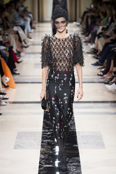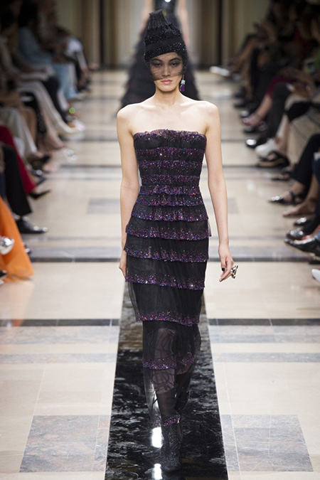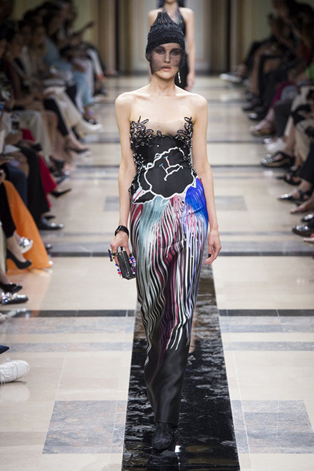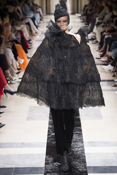 «Я хотел, чтобы коллекция была проникнута духом тайны», – рассказал журналистам сам дизайнер. Задуманное ему вполне удалось. Каждый из шестидесяти трех образов он дополнил особенным головным убором – длинной вытянутой черной шапочкой с блестками и черной вуалью, которая закрывает пол-лица. Вызывать соответствующие ассоциации призваны и яркие, похожие на маску, smoky eyes, – их моделям сделала визажист Линда Кантелло.