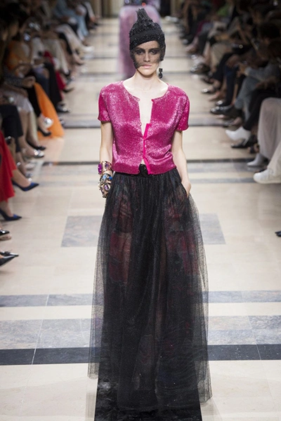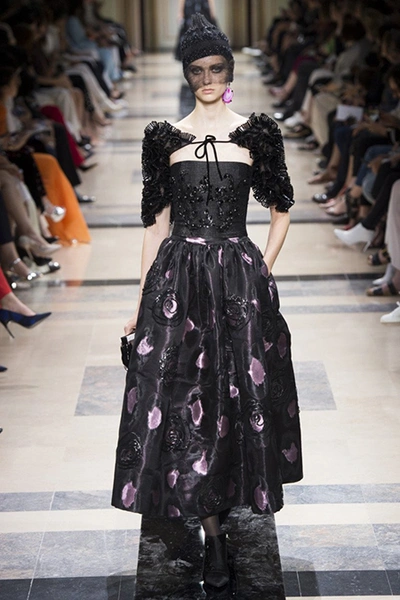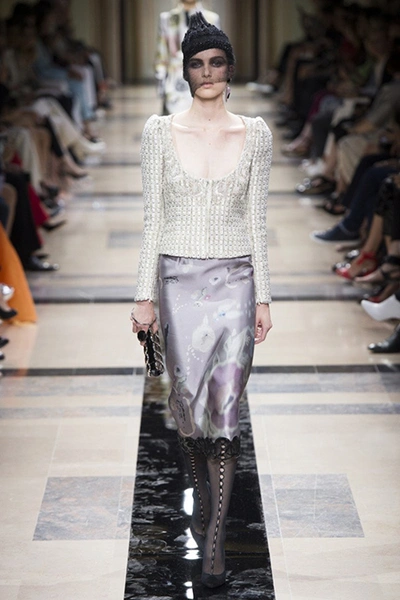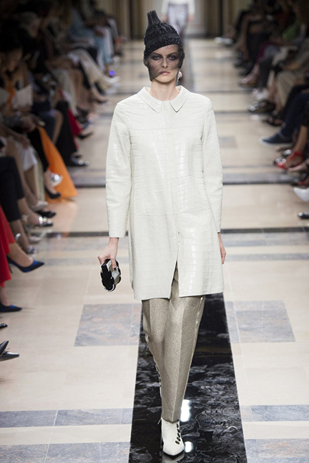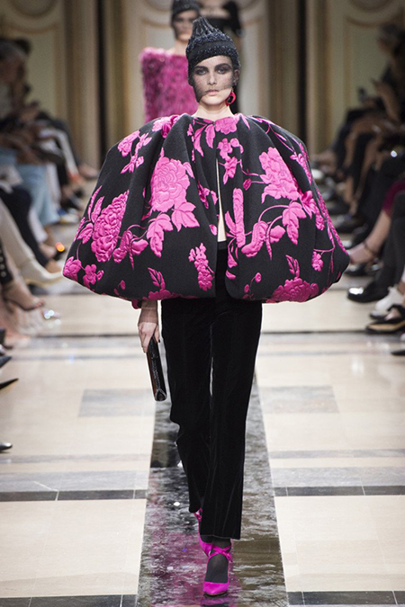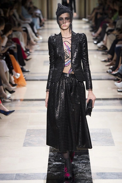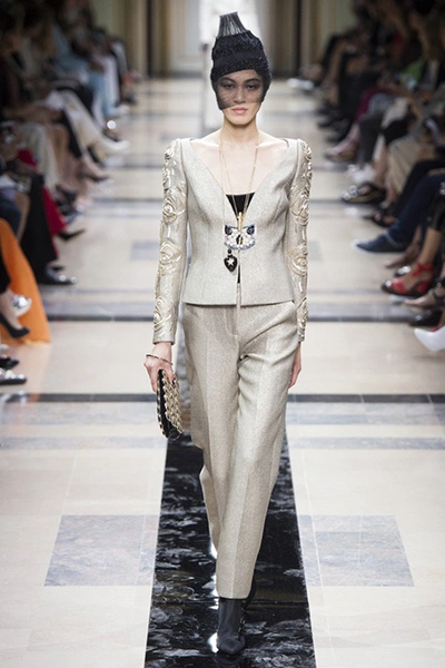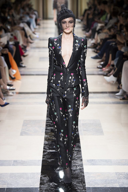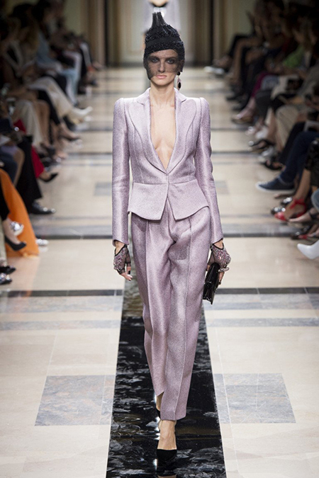Впрочем, в коллекции было и несколько вещей светлых, пастельных оттенков. В основном это эффектные power suits – брючные костюмы с жакетами с жесткой линией плеч, ставшие еще в 90-е годы визитной карточкой модного Дома. На этот раз у жакетов глубокие вырезы – в таком костюме вас ждут не на деловых переговорах, а на красной дорожке. Ход правильный – в конце концов, это кутюр.
