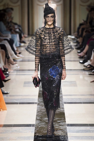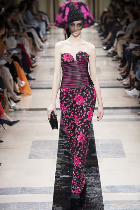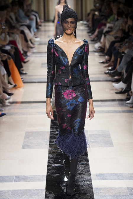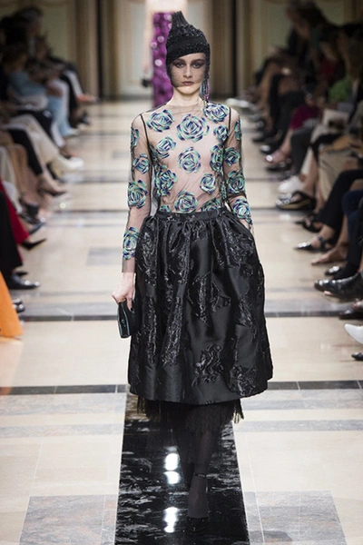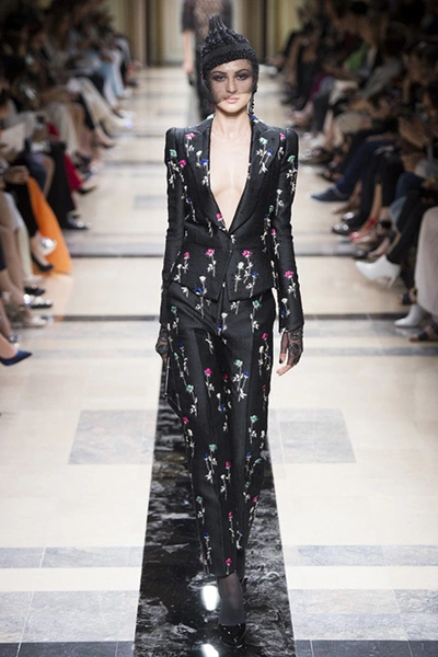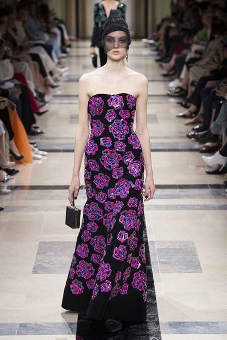 Главным принтом на этот раз стал цветочный. Cиние, голубые, светло-розовые и цвета фуксии, крупные соцветия вышиты или нарисованы на черных платьях, жакетах, шелковых брюках и узких юбках до колена. Кое-где на черном фоне «рассыпаны» блестки, напоминающее звезды на небе в ясную погоду.