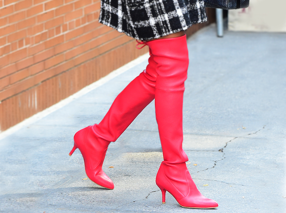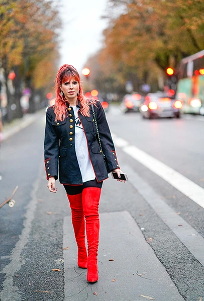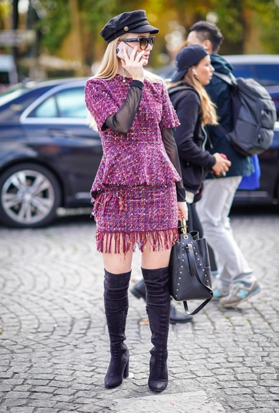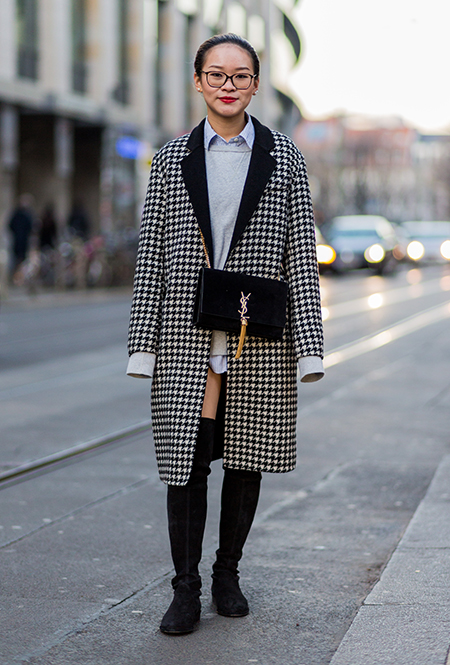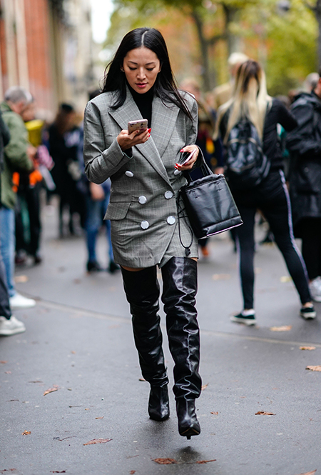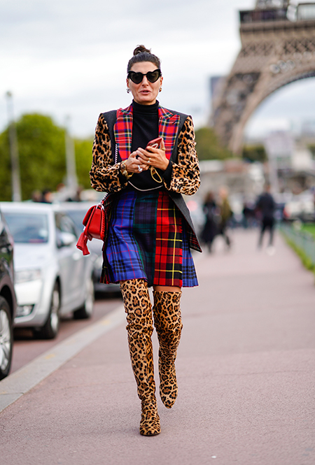 Вполне ожидаемо самой частой парой к ним становилась мини-юбка: такой союз сможет визуально удлинить ваши ноги, даже в том случае, если и юбка, и сапоги разного цвета. Второй по популярности подругой таких сапог стала клетка, расчертившая собой и жакеты, и пальто, и тренчкоты. Верхняя одежда, к слову, чаще была короткой, чем длинной — понятно, почему.