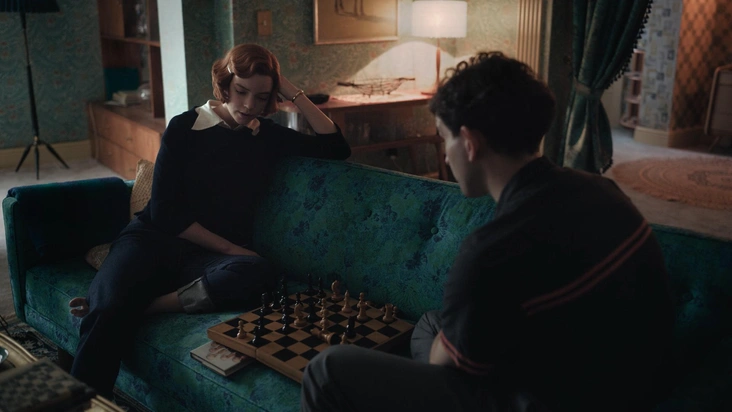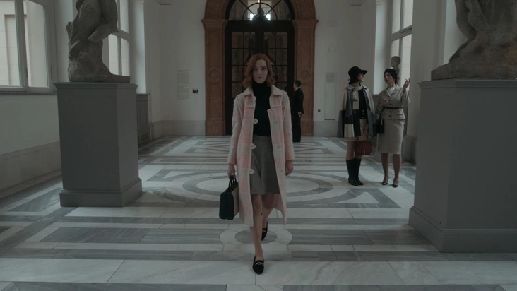 История Бет Хармон начинается в 50-х годах, с приюта и знакомства с уборщиком, который учит ее играть в шахматы в подвале здания. Эволюционируя от сверхъестественно одаренного ребенка в чемпиона штата Кентукки и перспективного игрока на мировой арене, Бет Хармон становится новой героиней феминизма и (довольно неожиданно) иконой стиля, за эволюцией которой действительно интересно наблюдать. Художником по костюмам выступила Габриэль Биндер, которая взяла за основу творения Кристиана Диора и Пьера Кардена.