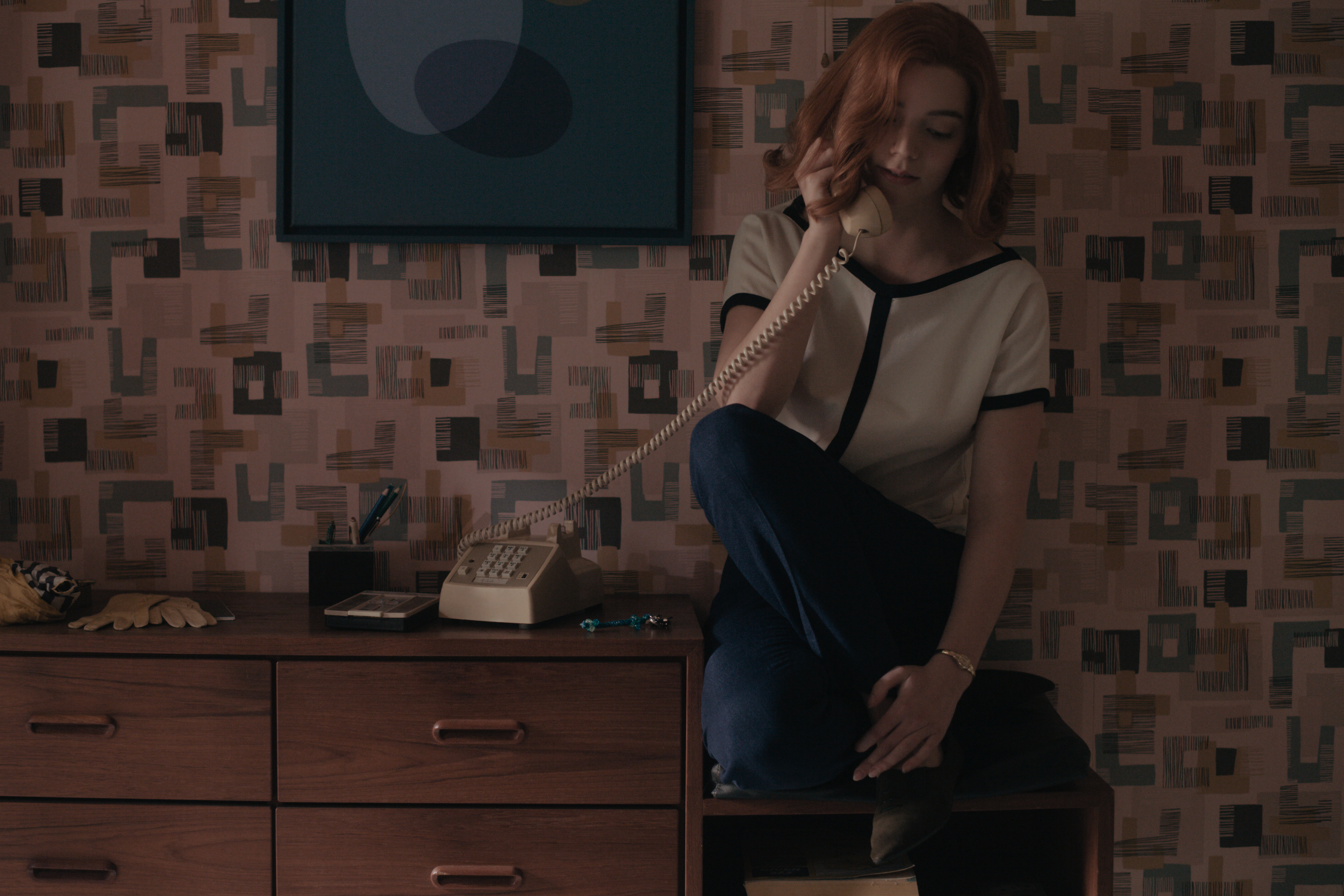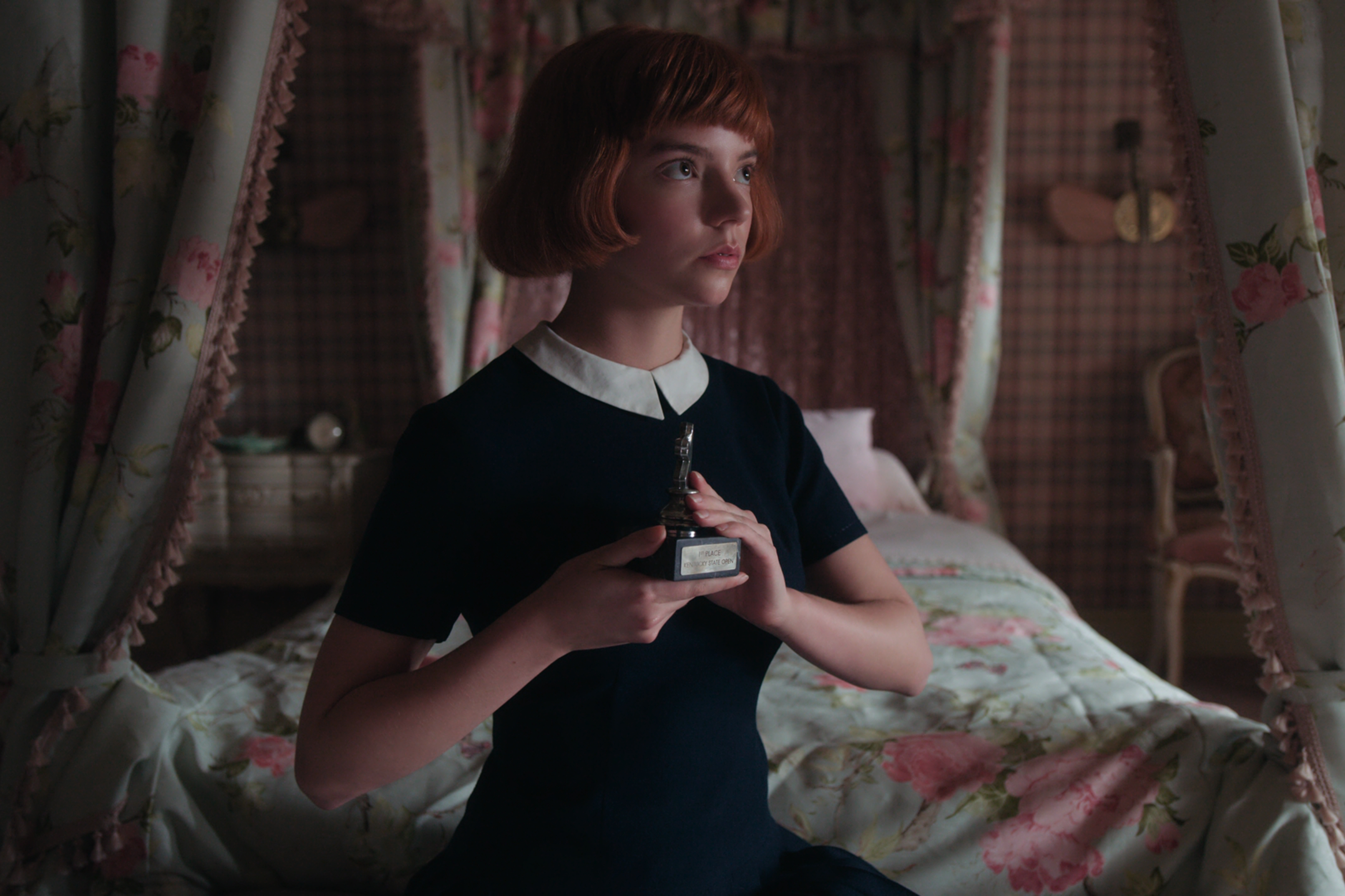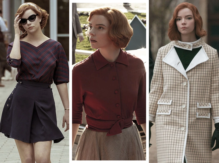 В приюте, где Бет Хармон оказалась после смерти матери, все девушки должны носить одинаковую форму и делать одинаковую стрижку. После усыновления Альмой Уитли и ее мужем и переезда в Лексингтон одежда девушки остается простой и несколько неподходящей из-за проблем с финансами. И только после победы в своем первом шахматном турнире она может позволить себе что-то, что лучше отражает ее вкус: приталенное платье с с пышной юбкой как отголосок New Look от Dior, надетое поверх простой белой рубашки так же, как на манекене в местном универмаге.