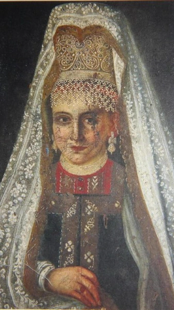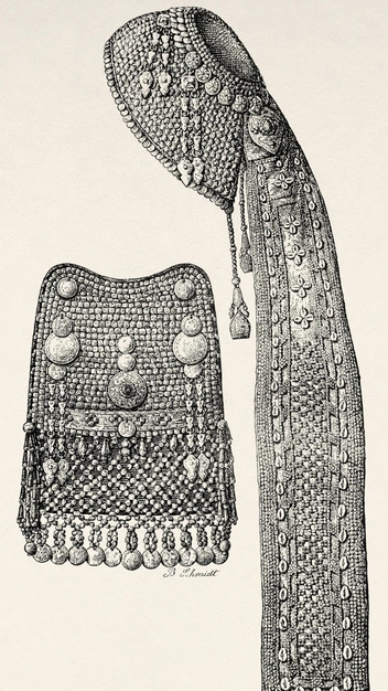 Женский головной убор, как и платье, тоже был многослойным. Дама надевала сначала повойник, который полностью покрывал волосы, заплетенные в две косы. Шапку шили из натурального полотна с твердым очельем — повязкой на лоб. Поверх нее, как правило, женщины повязывали урбус, тяжелый платок длиной в два метра, один конец которого наматывали на голову, другой закалывали возле шеи брошью.