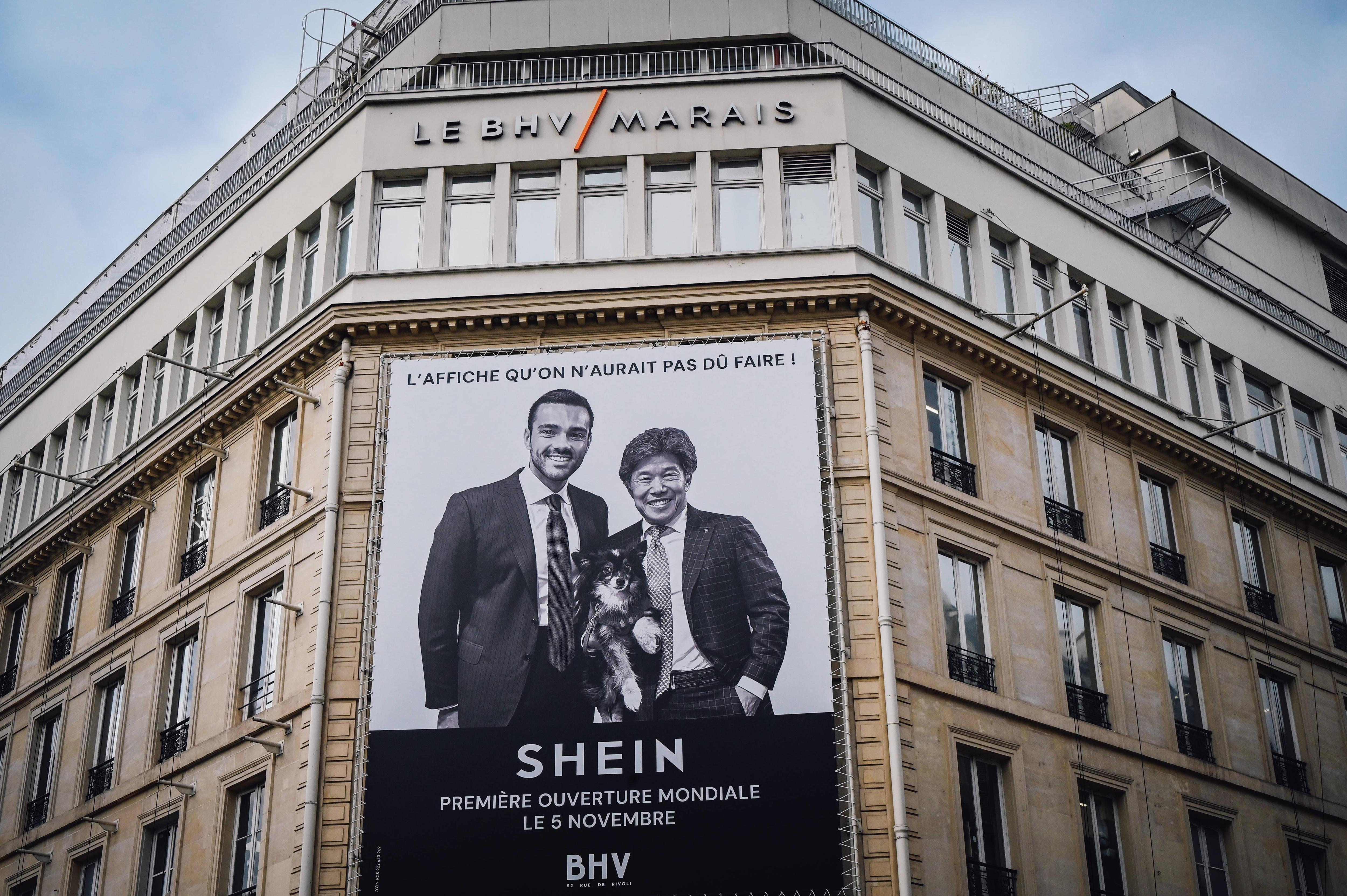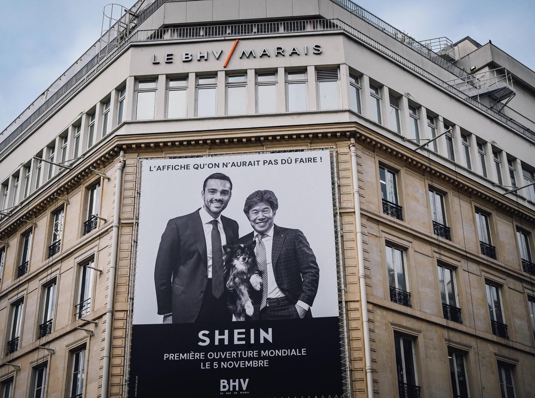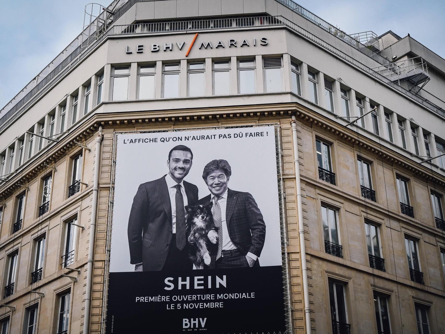 Плакат магазина Shein на здании Bazar de l’Hôtel de Ville