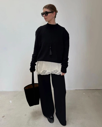 Душа требует романтики даже в холодный сезон, потому кружево остается нашими союзником и зимой. Нежные юбки и платья легко «переходят» в теплые образы — их можно носить с высокими сапогами или надевать поверх брюк. В тандеме с зимними вещами они создают идеальный баланс между нежностью и теплом, а минималистичные украшения и грубые материалы (кожа, замша или твид) еще больше подчеркнут контраст между хрупкостью кружева и суровой атмосферой зимы (читайте также: Как носить атлас и не оставлять зацепок и пятен — 6 секретов ухода, которые нужно знать).