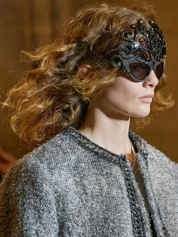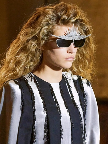 На показе Fendi Couture SS22 Питер Филипс создал «вуали» из страз на лицах моделей. Строгие и структурные наряды, дополненные украшениями в виде друз кристаллов от Дельфины Делеттрез, гладкими прическами и обилием сияния воссоздали ретрофутуристичный образ. А мы все еще помним кристальные татуировки от Swarovski, которые были очень популярны в начале 2000х.