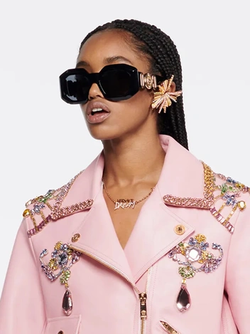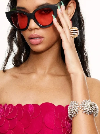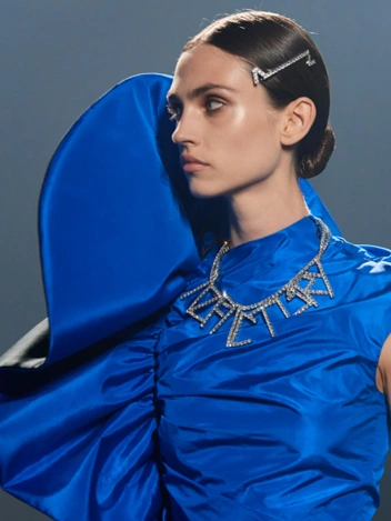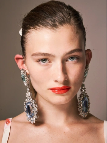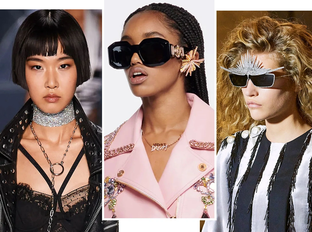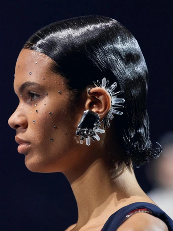 В сезоне весна-лето 2022 стразы выпустили на подиум даже те, от кого этого не ждали, при этом кристаллы даже не пытаются маскироваться под бриллианты, а предстают во всем своем гротеске. Оставьте в шкатулке деликатные теннисные браслеты и колье, пришло время крупных объемов и заметных цветов. Зона лица и декольте — место наибольшей концентрации блеска.