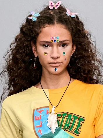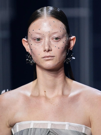 Показы сезона весна-лето 2022 в унисон показали, что не стоит ограничиваться блеском в одежде и аксессуарах, когда можно наклеить стразы прямо на лицо. Это могут быть как однотонные мерцающие мушки, так и россыпи разноцветных кристаллов. К тому же этому тренду так способствует популярность второго сезона сериала «Эйфория».